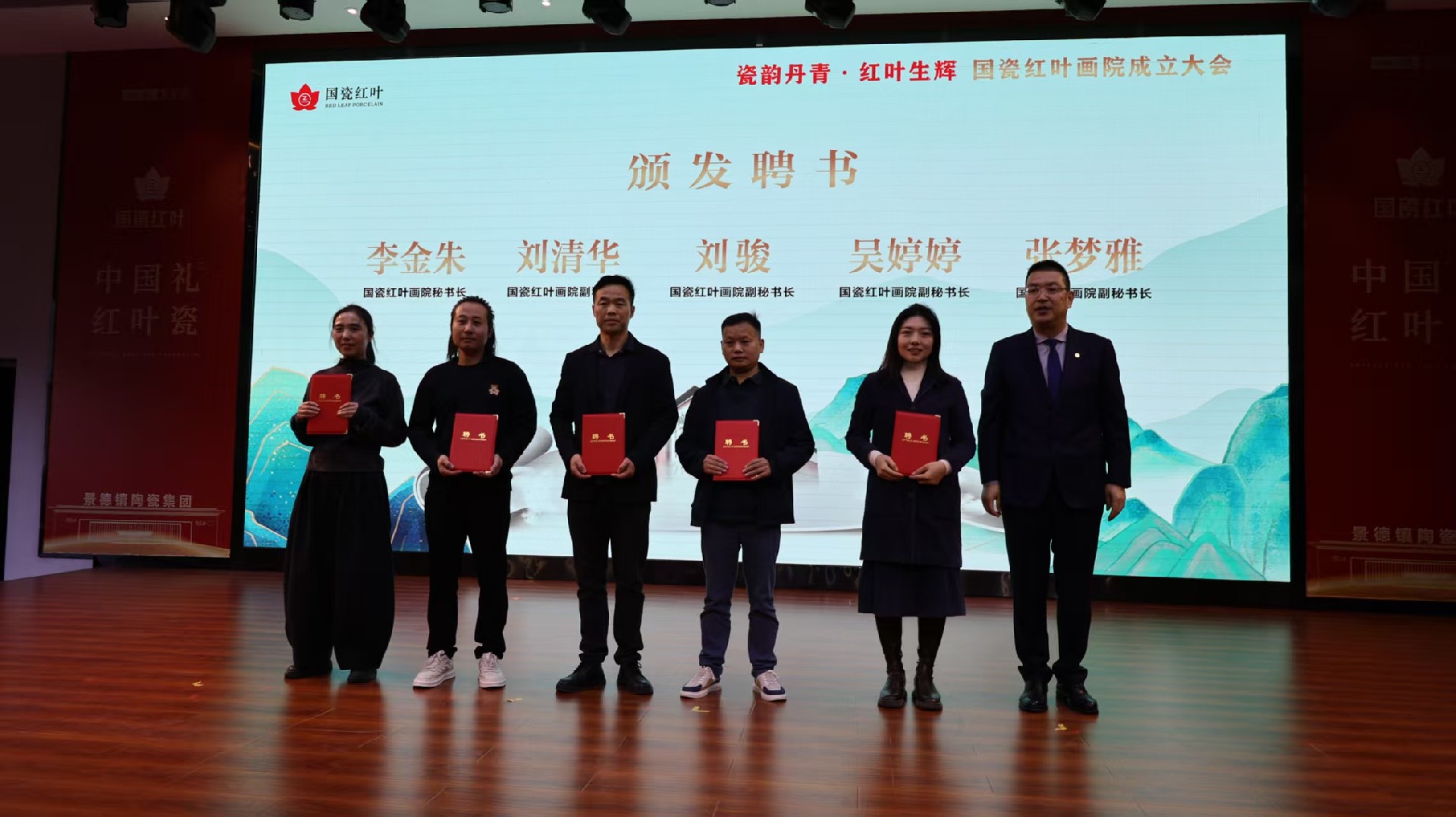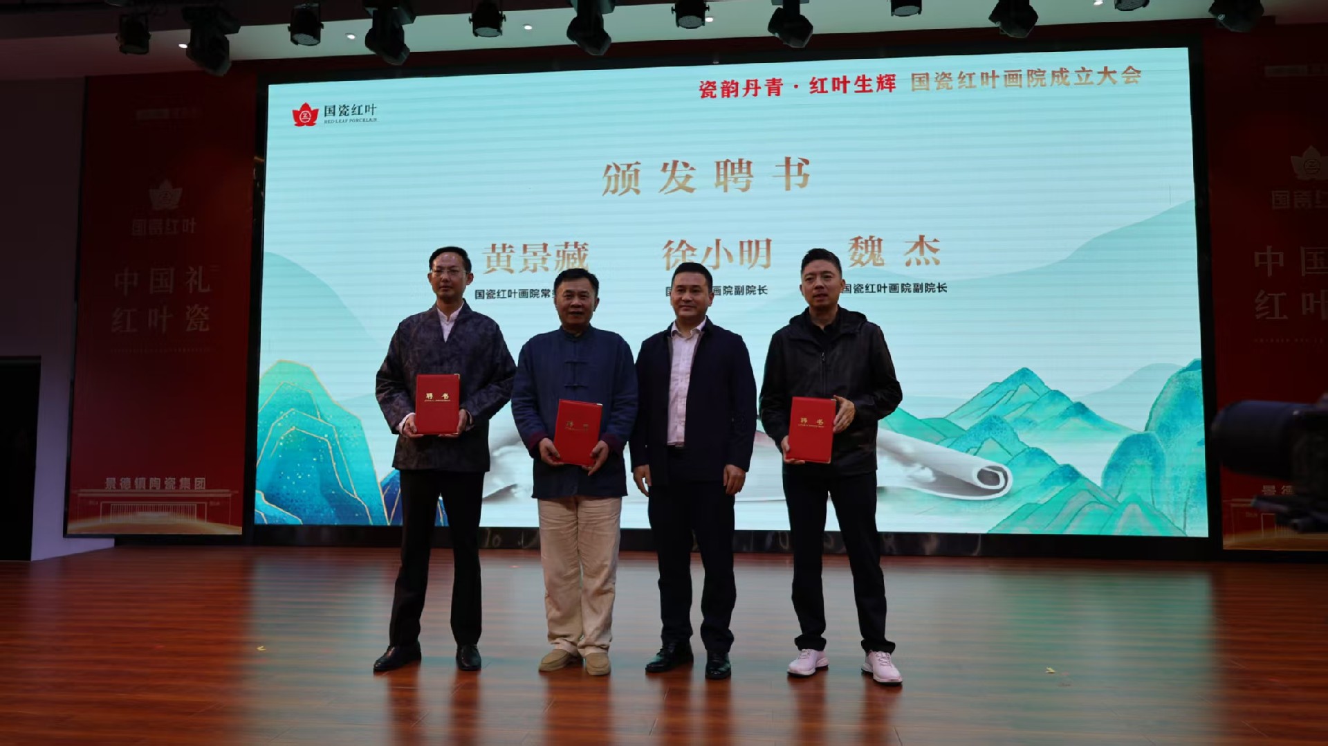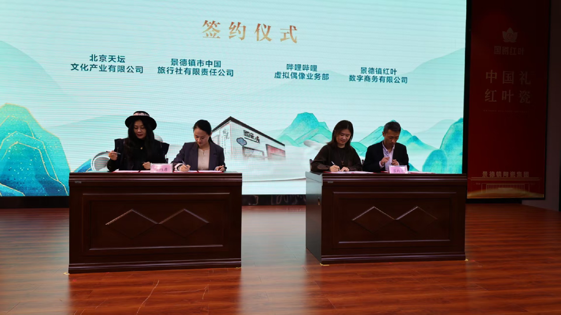 成立大会上,与会嘉宾共同观看了国瓷红叶画院宣传片,现场颁发了画院聘书,并完成了与北京天坛文化产业有限公司、哔哩哔哩虚拟偶像业务部的合作签约仪式。