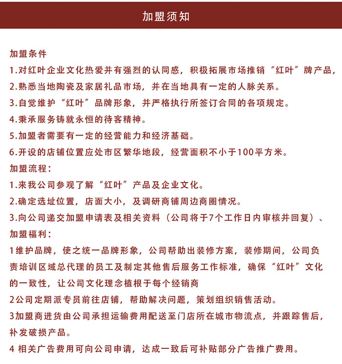 良禽择木而栖,我们热忱欢迎各界热爱红叶陶瓷且备具一定经济实力的有志之士,加盟“红叶”,与我们一起共同创造景德镇红叶陶瓷股份有限公司的美好明天。