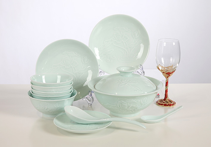 32头影青雕刻餐具荷花