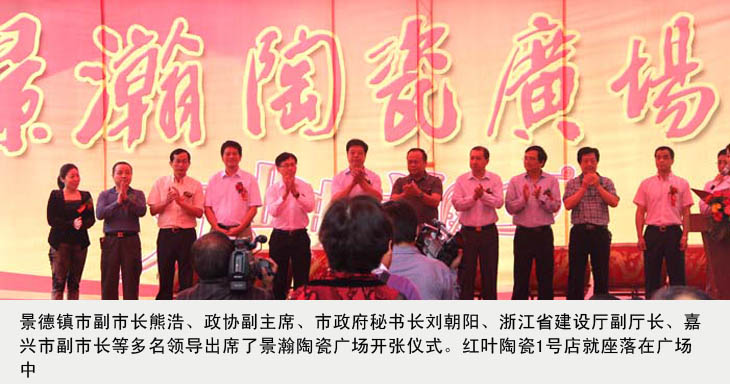 在景瀚陶瓷广场落成开业庆典仪式上,公司副总吴爱云受王耀董事长委托,代表景德镇陶瓷股份有限公司,代表红叶陶瓷1号店,代表所有进驻的业主们发言。她说:今天是五星级陶瓷购物天堂——景瀚陶瓷广场开业的大好日子,受王耀董事长委托,我仅代表景德镇陶瓷股份有限公司,代表红叶陶瓷1号店,代表所有进驻的业主们,对景翰陶瓷广场的开业表示热烈的祝贺。祝景瀚陶瓷广场开业大吉,生意兴隆。