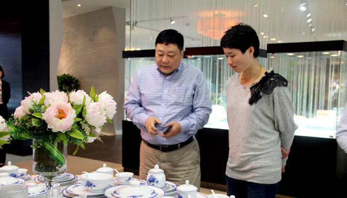 公司董事长王耀在给吴静钰介绍中南海二代瓷