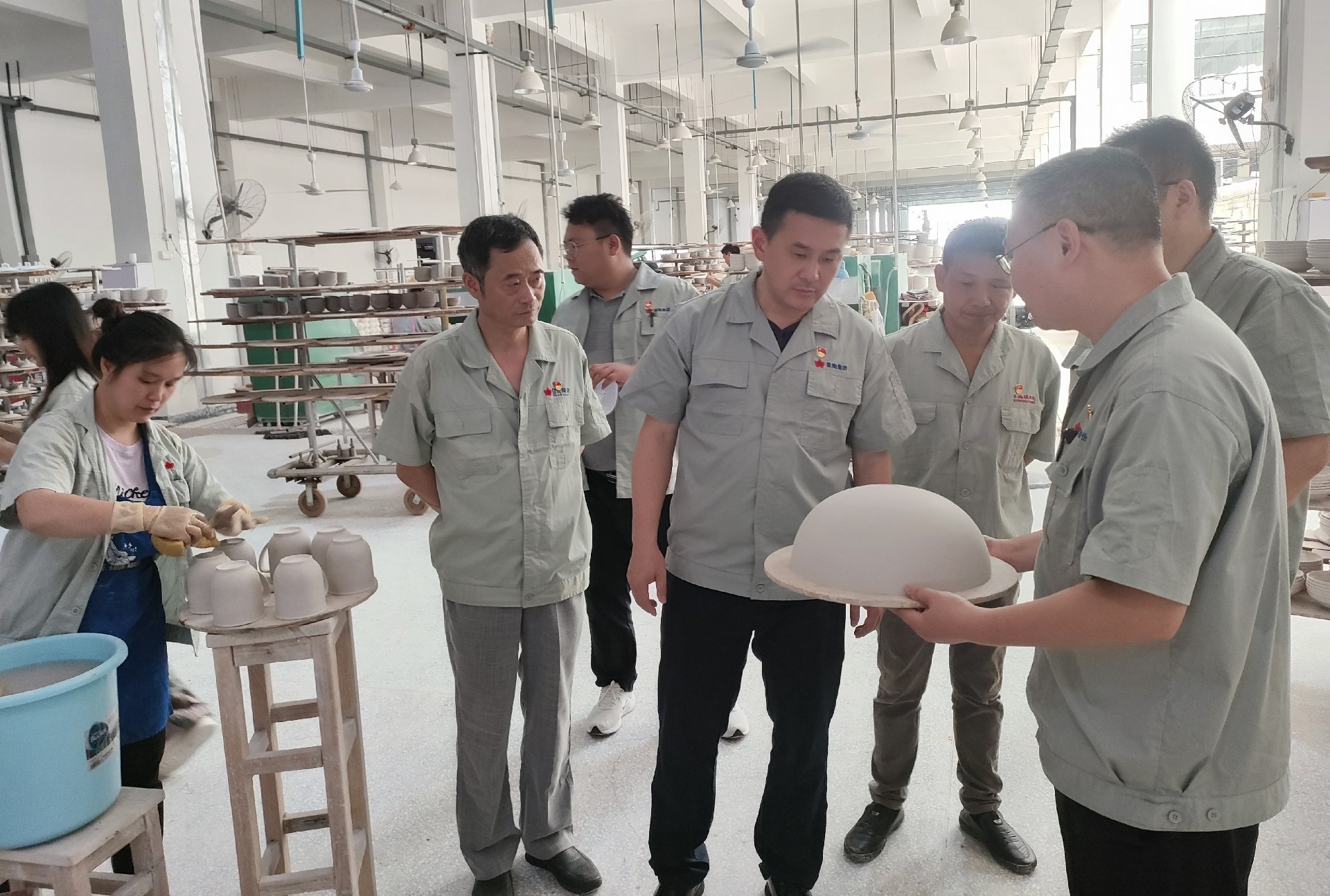 在生产车间调研中,邓景扬先后下到各个生产工序现场,从原料、模型、成型、烧炼到彩绘车间,对每个工序都进行了详细了解,重点了解了红叶一厂的整体生产能力及现状。