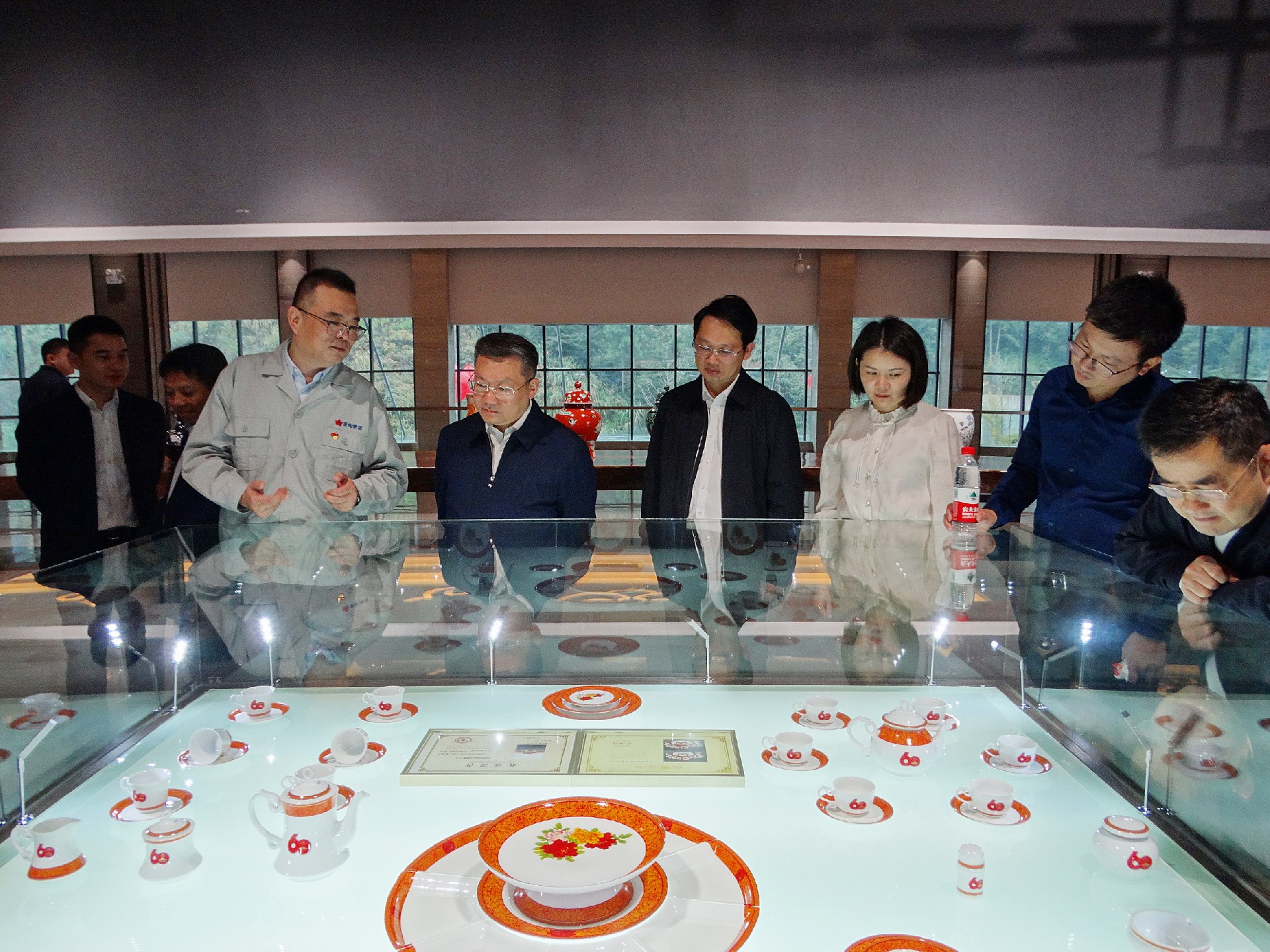 在国瓷馆,胡轶向陈澎一行讲解国瓷馆内的基本情况和产品特色。大家一路走一路看一路听,胡轶向重点介绍了“新中国成立60周年国庆庆典天安门观礼台专用瓷”、“‘瀛台夜话’接待外国元首用瓷”、“古典园林”、“首长专列用瓷”等。一个个国瓷故事和工艺细节,引得众人赞叹不已。陈澎还仔细询问了企业生产经营、对外贸易等情况。