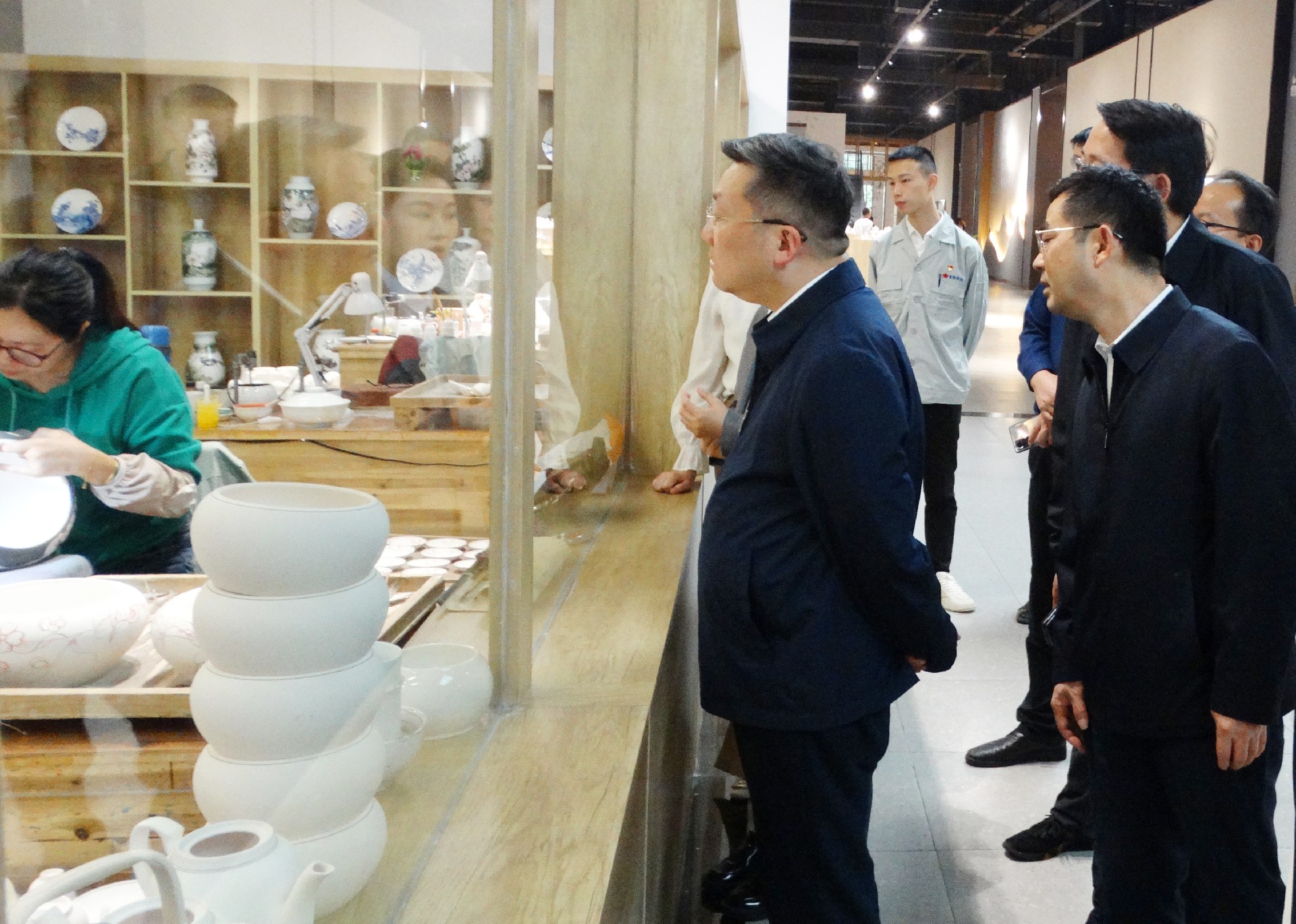 在绘画展示窗口,工人们正聚精会神地绘制碗、盘等器皿。陈澎饶有兴致地观看,并连连称赞她们的技艺,胡轶随即说道,我们集团对专业技术人才非常重视,还相继出台了一系列激励措施,陈澎听后给予了高度肯定和称赞。