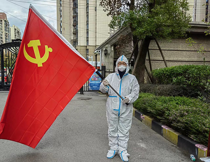 党员闵爱华,居住在高风险小区尚东国际。她每天四点钟就起床,挨家挨户地上门为居民做核酸,衣服被汗水浸透仍坚守在防控一线,只为疫情能够早日清零。