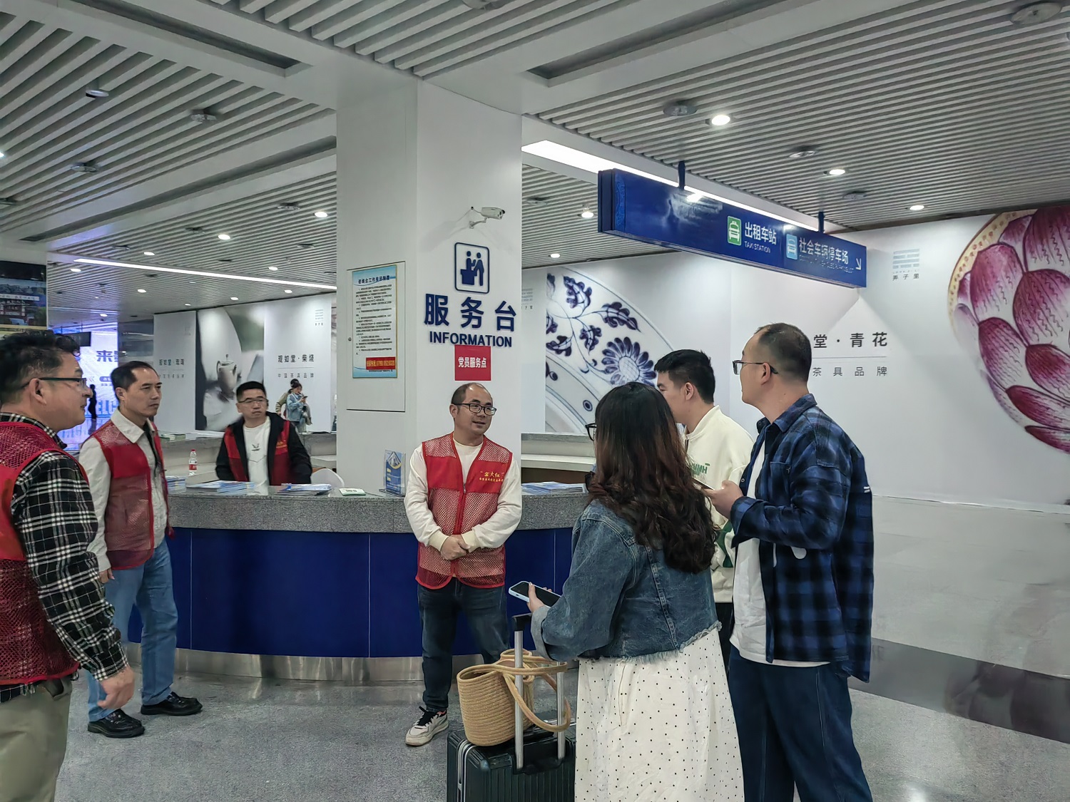 4月30日,五一假期前夕,55814红足1世组织70多名党员志愿者参加市“窑火红”党员志愿服务活动。他们身穿红马甲,忙碌穿梭在景德镇北站南广场,北广场和罗家飞机场的旅客中,为来景游客指引路线,提行李,推介美食美景美宿,引导车辆有序停放等,送上热忱暖心的服务,流动的红马甲成为一道靓丽的“风景线"。