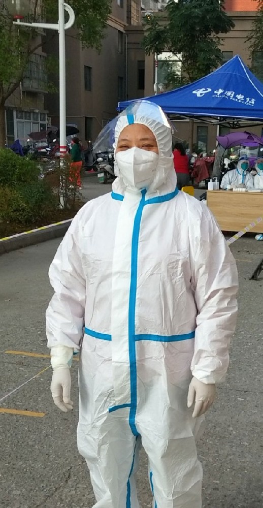 每天早上的闹钟固定设在在4:30分,铃声想起,夫妻二人便起床洗漱吃早餐,5点就赶到社区防疫岗位,有条不紊的穿戴好防护服,为全员核酸做好准备。当医护人员开始检测的时候,她们夫妇便在核酸检测队伍周围做好居民引导,维护队伍秩序,防止人员扎堆和核酸采集后的长时间滞留,每天采集的时间都是五六个小时,她们都会认真负责的坚守到队伍结束。大半天核酸采集完成,口干舌燥不说,连喝水如厕等生活细节都要严格遵守防疫措施,在核酸采集地维护秩序每天不知不觉也达到两万步。
